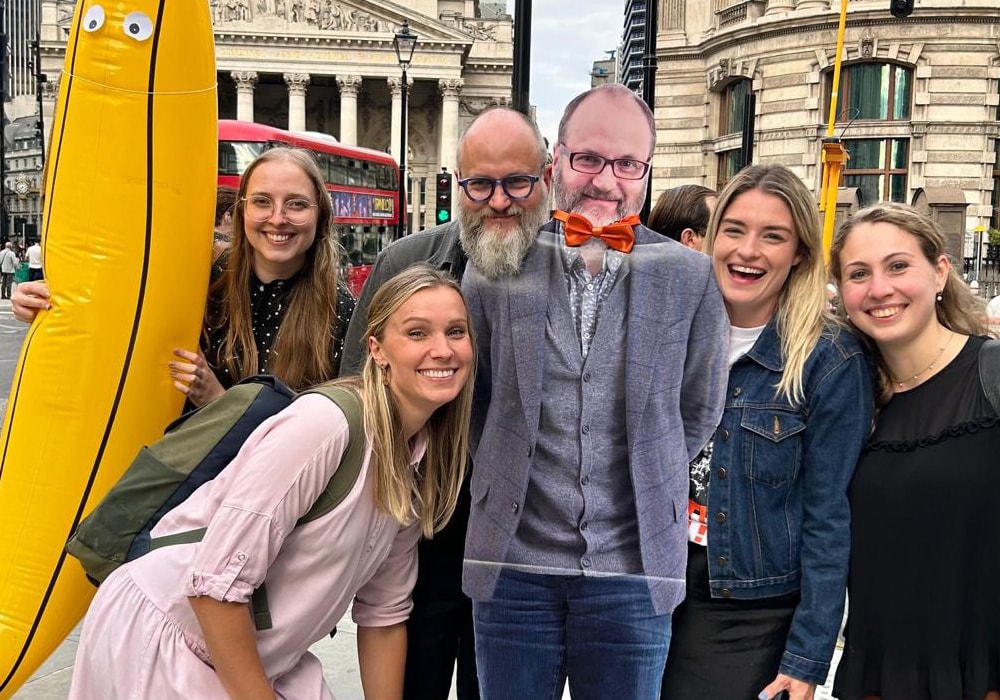 Cardboard Adam, real Adam and Ben Nana out on a farewell to the last office drinks with some of my old team